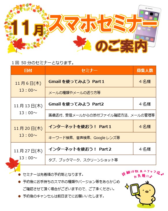 11月の茶屋町校スマホセミナーのご案内です✨✨