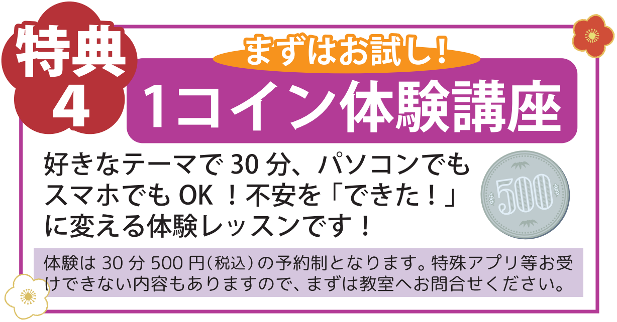 1コイン(500円)でご希望の内容が体験ができます✨