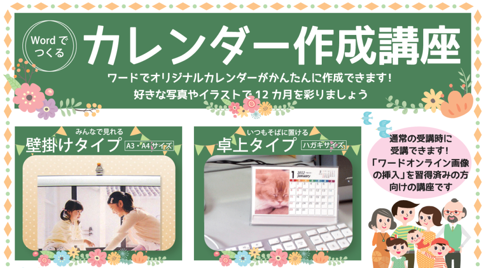 カレンダー作成講座 投稿日: 2025年11月18日2025年11月1日 岡山市北区にあるパソコン教室 PCらいふパソコンスクール庭瀬校です😀 毎年大人気のカレンダー作成講座の時期が今年もやってきました✨ 壁掛けタイプのA4サイズと、ケース付きの卓上サイズと選べる2サイズ!! 好きな絵や写真などを入れてオリジナルのカレンダーを作っちゃいましょう♪ 自分で作ったカレンダーが身近にあると、楽しい1年になること間違いなしです☺ ご興味のある方はスタッフまでお声がけくださいね!