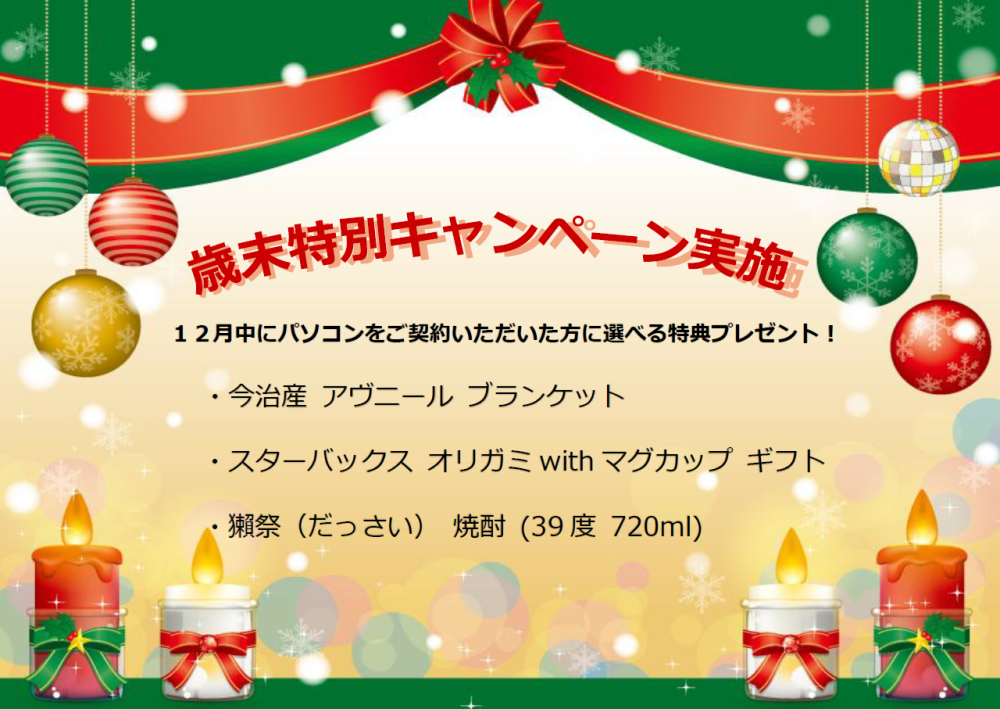 歳末特別キャンペーン実施 投稿日: 2025年12月16日2025年12月12日 岡山市北区にあるパソコン教室 PCらいふパソコンスクール庭瀬校です😀 只今、PCらいふでは歳末特別キャンぺーンを行っております✨ 今PCらいふでパソコンをご契約いただくと、とっても素敵な選べる特典をプレゼントしております! 対象の期間は12月1日~12月26日までとなっております。 クリスマスプレゼントや自分へのご褒美にいかがですか?♪