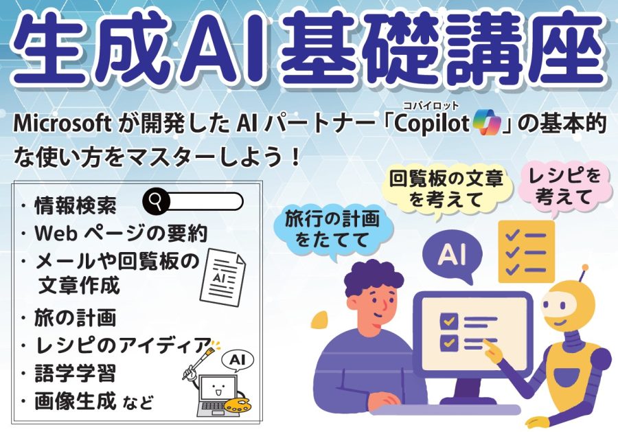生成AI使ってみませんか? 投稿日: 2026年2月3日2026年1月31日 岡山市北区にあるパソコン教室 PCらいふパソコンスクール庭瀬校です😀 最近ニュースなどでもよく耳にする「生成AI」 皆さんは使った事がありますか? 町内などでお知らせを作るときには、季語を入れたり正しい言いまわしになっているかなど気を使いますよね。 この心配を生成AIが解決してくれますよ✨ さらに、夜ご飯何にしようかな…と悩むことありますよね。 冷蔵庫の中身を伝えると、これも生成AIが解決してくれます✨ とても便利で様々な場面で活躍する生成AIを勉強してみませんか?