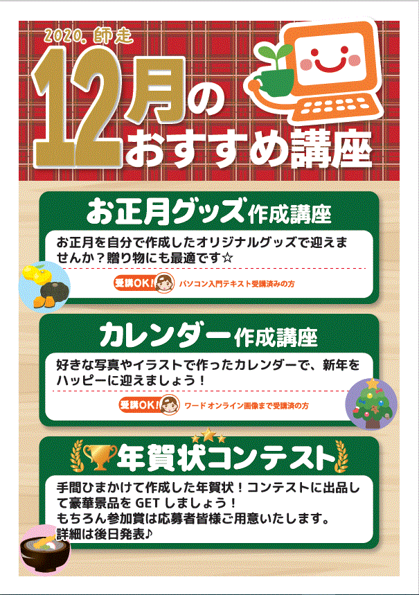 上記の期間、PCらいふパソコンスクール高梁校は休校となります。