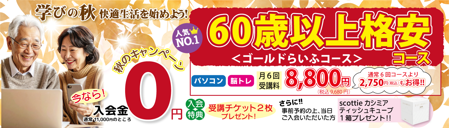 ただいま、とてもお得な秋のキャンペーンを実施中です。過ごしやすくなってきた学びの秋、パソコンをはじめるならPCらいふで始めましょう。この期間だけの特別な特典もございますのでご入会のチャンスです。