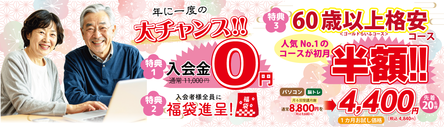 1/6(月)から新春キャンペーンを実施いたします。入会金無料など、この期間だけのお得な特典をご用意しておりますので、2025年にPCらいふパソコンスクールでパソコンスキルを身につけましょう。