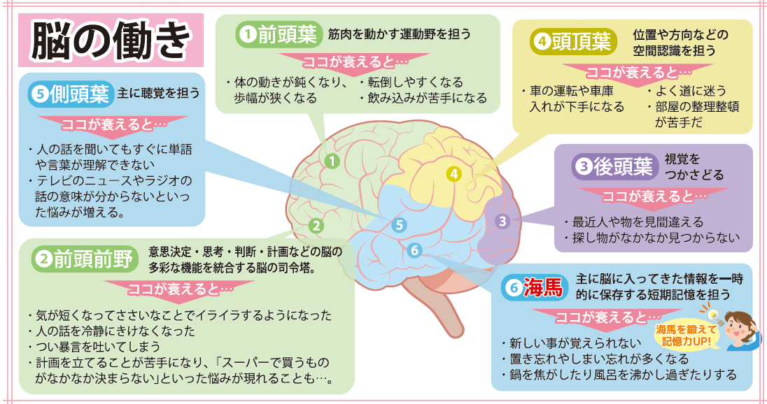 人間の脳には様々な機能がありますが、生活に大きな影響を及ぼす記憶、言語、計算、思考、理解、学習、判断等のいわゆる「 認知機能」は、通常 50歳頃から低下すると言われています。 しかし脳の衰えに関してはとくに痛みもないので放置してしまいがちです。75歳以上の方の車の免許更新には認知機能が義務付けられました。さらに今後高齢化社会が進んでいく中、認知機能低下予防対策はますます必要な時代になっていきます。まずは「脳」を活性化させるトレーニングを始めてみましょう。